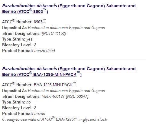 实验需要培养这两种细菌:Desulfovibrio C21_c20和Parabacteroides distasonis ,第一种在ATCC没有找到,第二种搜索后出现两种,不知道哪个才是要的,名字都没有看懂。大家一般买菌种在哪里买?求帮忙! 1.jpg 2.jpg |