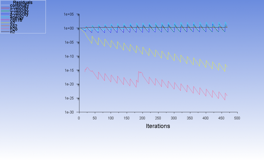 加上燃烧反应的fluent残差如图所示。正常吗?还是哪里出问题了?