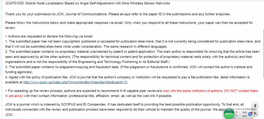 虫子们,JCM投稿后编辑让回复这个邮件,才送去外审,怎么回复的啊,求给个模板 > Authors are requested to declare the following via email: 1. The submitted paper has not been copyrighted, published or accepted for publication elsewhere, that it is not currently being considered for publication elsewhere, and that it will not be submitted elsewhere while under consideration. The same research in different languages. 2. The submitted paper contains no proprietary material unprotected by patent or patent application. The main author is responsible for ensuring that the article has been seen and approved by all the other authors. (The responsibility for technical content and for protection of proprietary material rests solely with the author(s) and their organizations and is not the responsibility of the Engineering and Technology Publishing or its Editorial Staff.) 3. The submitted paper contains no plagiarism/copying and fraudulent data. (If the plagiarism or fraudulence is confirmed, JCM will contact the author’s institute and funding agencies). 4. Agree with the policy of publication fee: JCM is journal that the author's company or institution will be requested to pay a flat publication fee, detail information is available at https://www.jocm.us/index.php?m= ... s&catid=13. > For speeding up the review process, authors are expected to recommend 4~6 capable peer reviewers (not with the same institution of authors, DO NOT contact them in advance) with their contact information: professional title, affiliation, email, as well as the web link if possible. B$`P6BEYV9XO{LWD8$[8ABO.png |