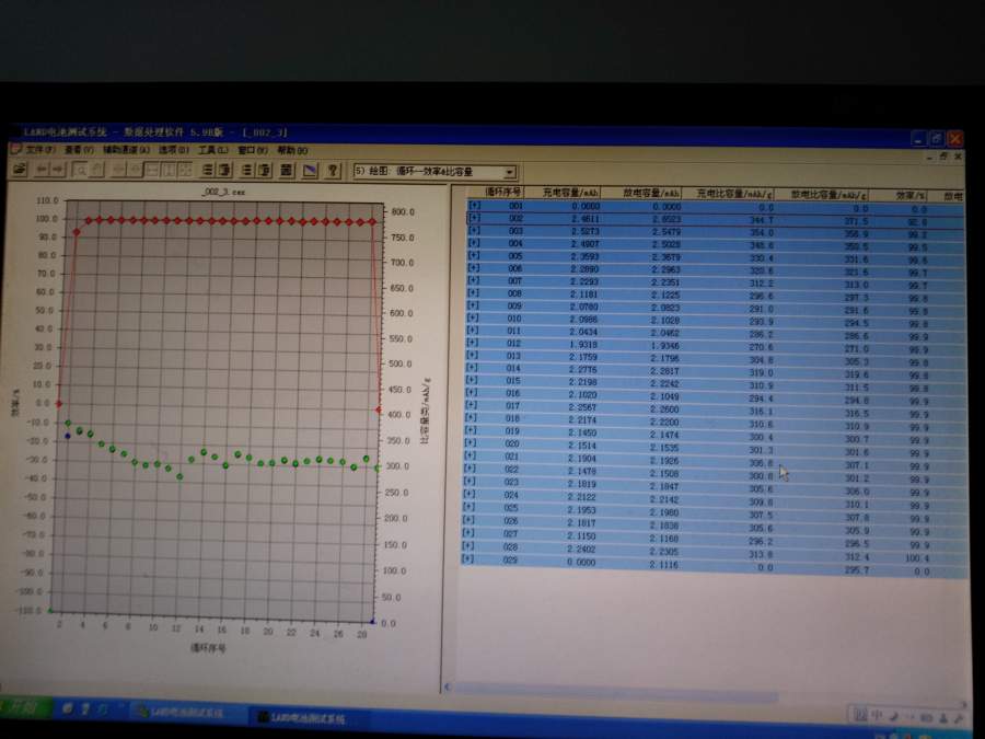 最近做的石墨负极按石墨:SP:CMC:SBR=90:5:1.5:3.5组装成半电池后,全部电池都与图中情况类似,容量蹦蹦跳跳的,石墨换了好几种,可以确定不是石墨的问题,不知道是什么引起的?求解啊? IMG_20170105_141320.jpg |