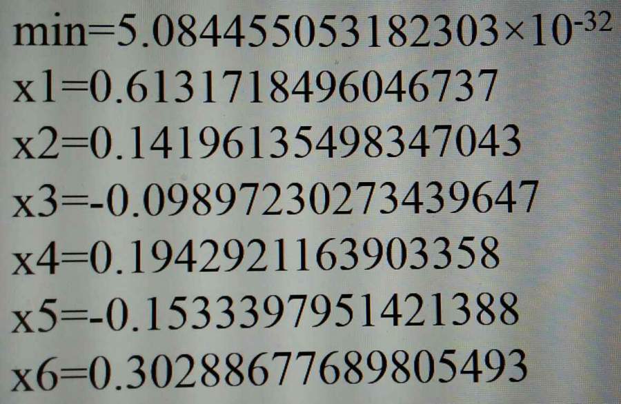 1stOpt求解,有两组吧: No. 1 2 x1 0.613171849604674 -0.702325268620922 x2 0.141961354983471 1.17411831970612 x3 -0.0989723027343964 -1.04350327341153 x4 0.194292116390336 1.34179412355961 x5 -0.153339795142139 0.242185011702972 x6 0.302886776898055 -0.0122689129362481 |
