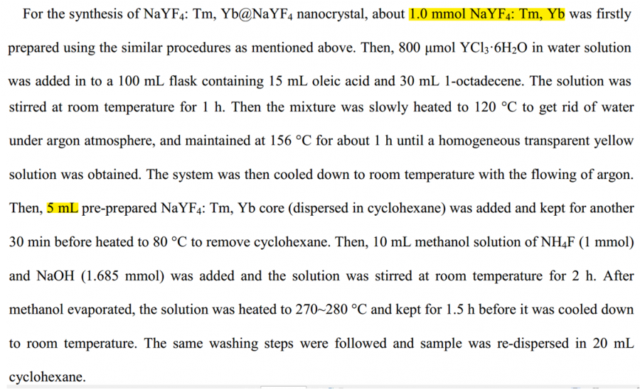 现在制备出来了NaYF4: Tm, Yb,但是想要的发射光比较弱,打算在外面再包一层Y3+,目前看的文献里面对于取NaYF4: Tm, Yb的量写的都很模糊,如图文献中提到的是1.0mmol的NaYF4: Tm, Yb,请问这个是怎么算出来的。我制备的上转换已经烘干成了粉末,我到底应该取多少的量?各位大神指教一下!!! 图片1.png |