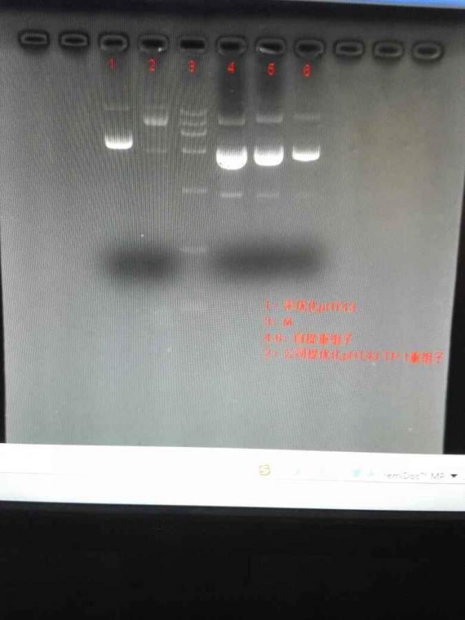 1号为空质粒,2号为公司提取的重组质粒,3号为15,000M,4-6为自己提取重组质粒。空质粒大小为8K,插入片段大小400bp,请问出现这种情况是什么原因?M从上到下为15,000、10,000、7500、5000、2500 发自小木虫Android客户端 |