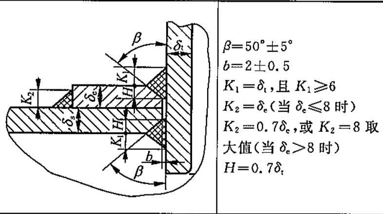 图里的H和K1分别标注的是什么?我分不清。这里面K2是关于补强圈厚度的关系式啊,算出来焊缝面积是个函数?补强圈厚度=另加补强截面积补强A/(D补强圈外径-D补强圈内径)?谢谢大家了吖! 开孔补强.png |