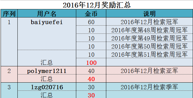 【检索知识】版2016年12月应助达人获奖名单及奖励