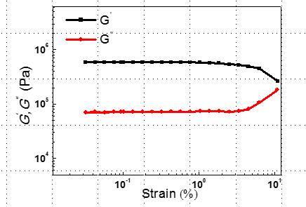 在高应变区域,G’下降,这种现象是可能的,你可以看一下以下文献:Robust Self-Healing Hydrogels Assisted by Cross-Linked Nanofiber Networks. Scientific Reports 2013, 3:2811.