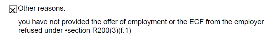 拿到加拿大博后offer,时间是2016.10-2017.9. 然后我跟现在学校请假,准假信时间是2017.1-2017.12 然后我就申请2017.1-2017.12。 再然后我就悲剧了。 这是反馈的原因。 请问大家这个ECF是什么?还是可以确定是offer的时间原因? 现在要怎么样补救呢? |