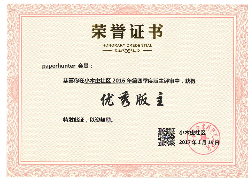 恭喜【paperhunter】获得2016年第4季度优秀版主