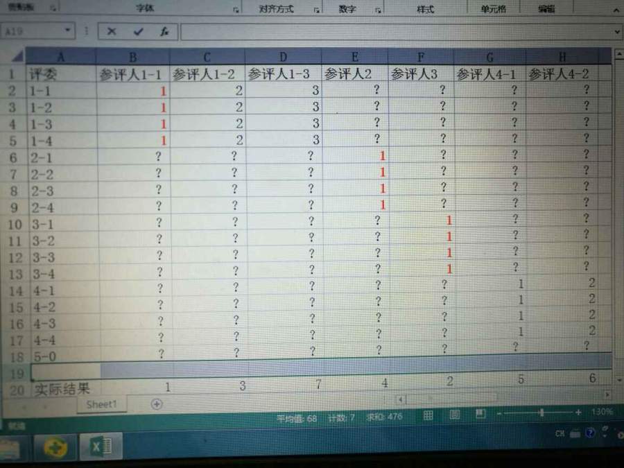 前两日单位调级评选,来自不同研究室的7个候选人中选4个,我对比了一下,论业绩我可排第一,论人品人缘也还算不错,应稳进前3,但结果却让我傻眼,只排到第5,其中有一个研究室的评委整体把我排到第7。我这才研究其中的评选奥妙,发现这里面是个数学问题,故提出,求解。 数学题:4个研究室,每个室出4个评委,加1个所领导,共17个评委,分别对来自4个研究室的7个候选人进行排序,排序结果加合,结数字由小到大排序,最终得出图示结果,每个评委如何排序,能得出这种结果?如果要调控排序结果,每个评委又应如何排序?(备注:默认各室首推本室候选人。表中第一列1-1,1-2,1-3,1-4表是研究室1的4个评委,其余类推推。第一行表示候选人是研究室1有3个,研究室2有1个,研究室3有1个,研究室4有2个。) 发自小木虫Android客户端 |
