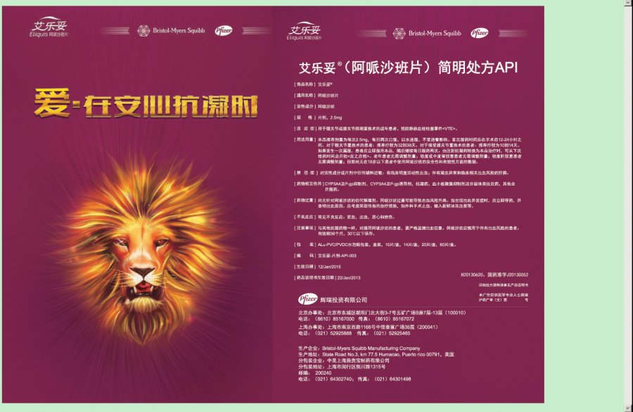 | 由百时美施贵宝和辉瑞联合开发的抗凝新药艾乐妥中文说明书 |