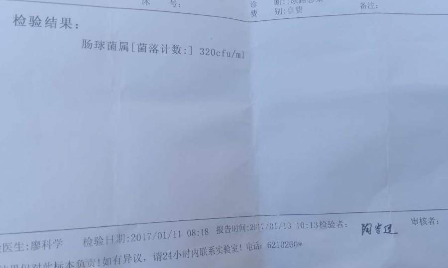 各位老师同学,你们好!前几天替人去医院拿了一个化验单,结果化验室的人不能解释这是什么毛病。辗转问了三个医院的医生,都不能解释这是什么情况。因此,前来小木虫求教,请问【肠球菌属(菌落计数) 320cfu/ml】是什么意思? 836580455094238806.jpg |