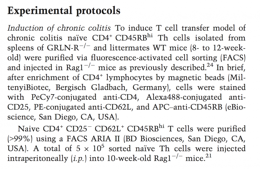 实验规程 慢性炎症的诱导:为了诱导T细胞转移的慢性炎症模型,如前述[24]从GRLN-R-/-及同窝出生的WT小鼠(8-12周大小)脾脏分离幼稚CD4+CDRBhiT细胞经荧光激活细胞分选仪(FACS)纯化然后注入Rag1-/-小鼠。简言之,将CD4+细胞用磁珠(.........)富集后,以PeCy7结合的抗CD4,Alexa488结合的抗CD24,PE结合的抗CD62L以及APC-抗CD45RB(...........)染色细胞。 幼稚CD4+CD25-CD62LCD45RBhiT细胞用荧光激活细胞分选仪(FACS)ARIA II(..........)纯化(>99%).将总数5x10(5)分选的Th细胞腹腔注射(i.p.)10周龄Rag1-/-小鼠[21]。 T cell transfer model of chronic colitis是指用T细胞转移诱导慢性炎症的模型 |
