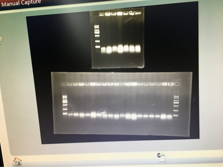 上样孔非常亮,说明基因组DNA浓度很高,就是说你的模板加太多了,之前把浓度降低十倍才行。正常菌落pcr几乎不会在上样孔里看见条带的。 发自小木虫Android客户端 |