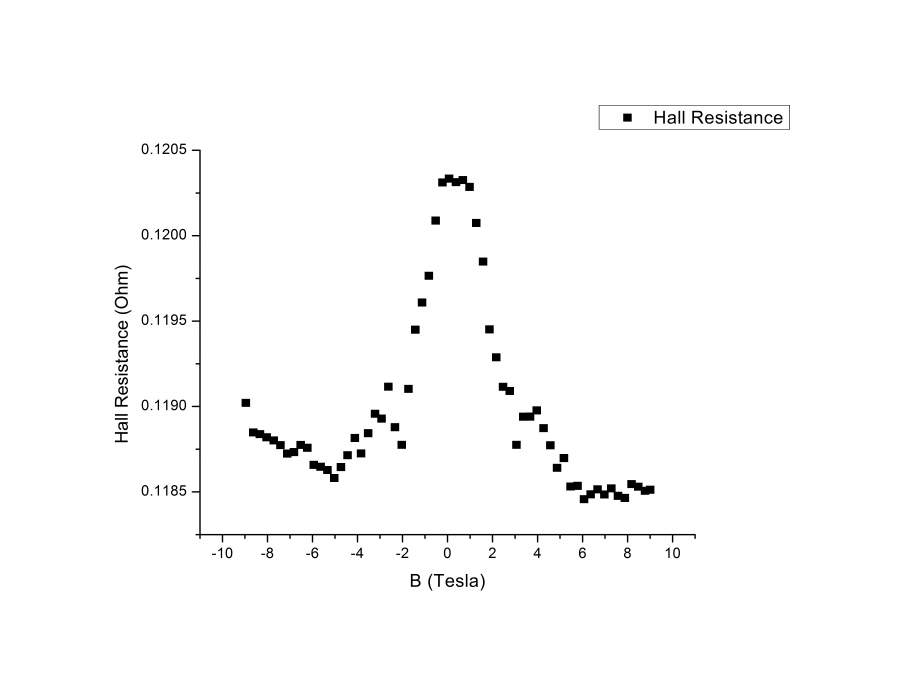 采用PPMS测试了半导体薄膜的霍尔电阻随磁场强度的变化曲线,得到如下图所示的数据。测试接线方法为范德堡法接线。请各位大神帮忙分析一下。 曲线是否正确?难道是我的样品是双载流子导电?如何计算每种载流子的迁移率,要取那一段的斜率来计算? Hall resistance -B.jpg |