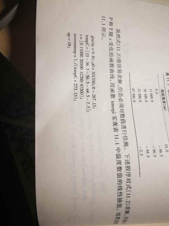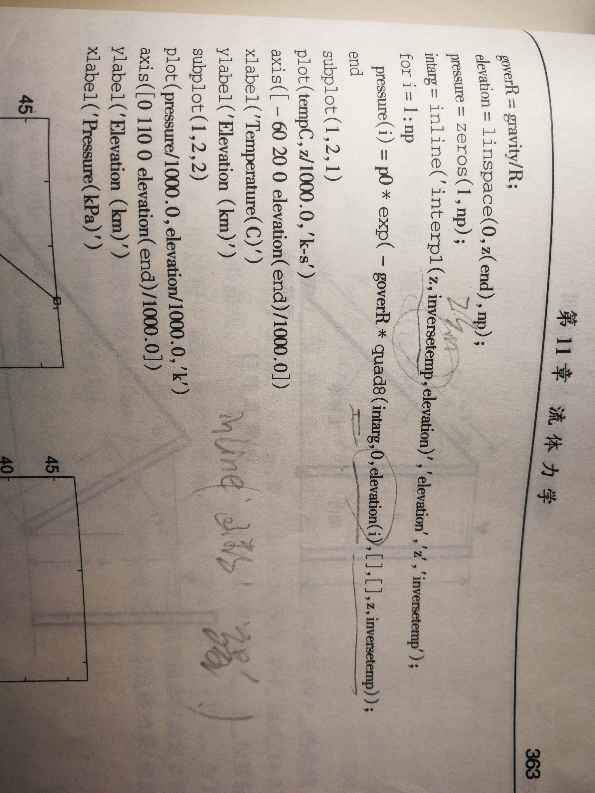 这本书应该比较老了,其中inline函数和quad8函数已经接近淘汰了,现在可以采用匿名函数和integral来替代。 单说这两个函数的用法inline用来定义函数,inline('fun','x','y'),其中fun是函数的表达式,x, y是定义的变量。此例中,函数为‘interp1(z,inversetemp,elevation)’采用一维线性插值计算当z=elevation时温度的值,其中变量为'elevation','z','inversetemp',实际上'elevation','z',是已知条件,不应该作为变量。 quad8(intarg,0,elevation(i),[],[],z,inversetemp))函数是用来求定积分的,intarg为积分函数,(0,elevation(i))为积分上下限,如上所述,intarg中'elevation','z',实际上并不是变量,所以这里在最后将,z和inversetemp直接传递给了intarg函数,其中两个[]是用来缺省中间参数的,因为quad8这个函数从第六个输入变量开始才对应的是传递参数。 实际上以上两个函数可以简化为以下形式,直接将程序中对应的地方更改成下面的程序即可。 |