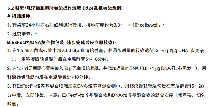 我们一般都是直接按照说明书操作的,方法步骤如下: 贴壁/悬浮细胞瞬时转染操作流程(以24孔板转染为例) A. 细胞接种: 1.转染前24小时左右对细胞进行转接,接种密度约为每孔0.3~1×105个细胞; 2.过夜培养。 B. DeofectEU /DNA复合物包装(该步完成后应立即转染): 1.在1.5 ml无菌离心管中加入50μl无血清培养基,并添加适量的转染试剂(2~5μl/μg DNA,参见下表) 。用移液器轻轻混匀后在室温静置5~10分钟。 2.在1.5 ml无菌离心管中加入50μl无血清培养基,并添加适量的DNA (0.8~1μgDNA/孔, 参见附表)。用移液器轻轻混匀后在室温静置5~10分钟。 3.将DeofectEU-培养基混合物滴加至DNA-培养基混合物中,用移液器轻轻混匀后在室温静置15~20分钟后,立即转染。注意: DeofectEU-培养基混合物和DNA-培养基混合物的混合次序非常重要,切勿颠倒。 C.转染: 注意:DeofectEU 在完全培养基中(基础培养基中添加血清)具有最高的转染效率,因此转染前后不需要换成无血清培养基。 1.如特殊情况,可在转染开始之前更换新鲜的含血清培养基,以防转染后孵育阶段细胞密度太大、营养不足导致的细胞死亡。 2.将步骤B制备的复合物滴加至培养基中。轻轻晃动培养皿以使复合物均匀分布。 3.过夜培养24~48小时。 4.注意:如果转染后需要更换新鲜培养基,请于加入DeofectEU /DNA复合物12~24小时后进行。培养基更换后,孵育24~48小时后再进行后续实验。 5.收获细胞,进行后续实验。 |