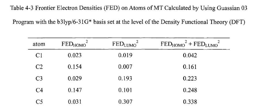本人最近刚接触Gaussian,通过计算之后得到了下面的数据 119 120 121 O V V Eigenvalues -- -0.11918 -0.04446 -0.00491 1 1 C 1S -0.00068 0.00432 -0.00157 2 2S -0.00057 -0.00145 -0.00172 3 2PX -0.04168 -0.21801 -0.27065 4 2PY 0.00575 0.01563 0.03407 5 2PZ -0.00492 0.07028 0.1002 6 3S 0.02321 -0.12005 0.03303 7 3PX -0.00999 -0.27006 -0.29906 8 3PY 0.01669 0.02555 0.1103 9 3PZ 0.03415 0.03507 0.15939 10 2 C 1S -0.01569 -0.00025 -0.00031 11 2S 0.03085 0.00098 0.00334 12 2PX 0.0722 -0.07377 0.27353 13 2PY -0.04183 0.01596 -0.05054 14 2PZ 0.02969 0.02587 -0.11202 15 3S 0.122 -0.01407 0.01516 16 3PX 0.06252 -0.09328 0.3714 17 3PY 0.00832 0.01282 -0.07408 18 3PZ 0.02139 0.02899 -0.15234 19 3 C 1S 0.00672 -0.00072 -0.00109 现在我知道119是HOMO,120是LUMO 那如果我要计算1号C原子在HOMO上的电子云密度该怎么算? 就像文献中的那样,见图 第一次接触量子化学,就是想得到图中那个结果就行了,求好心人帮帮忙 捕获.JPG 捕获1.JPG@jiewei |