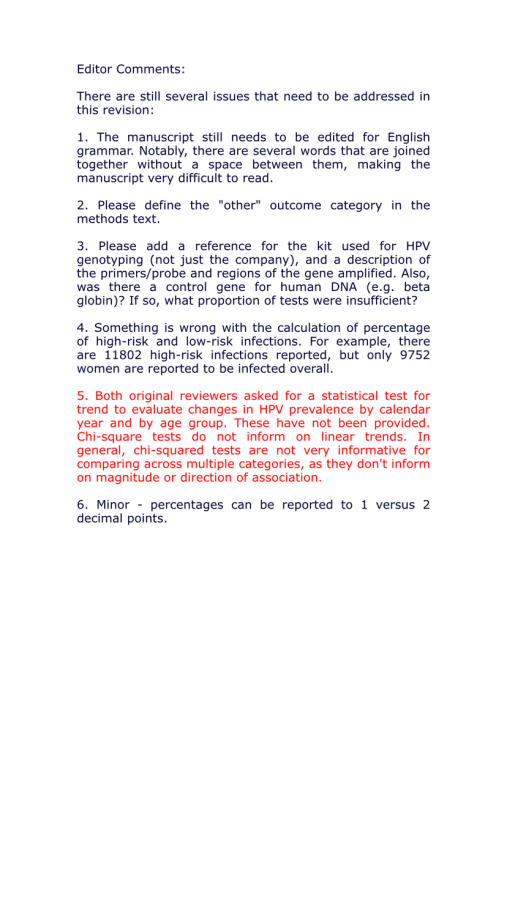 我的文章是关于近五年某地区HPV的感染情况。结果发现近5年,某个年龄段的人hpv感染率逐年上升,我做了五年感染率的比较是有差异的。编辑回复说,对于这五年感染率增高的趋势做卡方检验不合适,不能反映关联趋势和方向。 我的统计知识就只限卡方 1.想问问各位大神我应该才用什么检验,能反应这五年该年龄段感染的趋势 2.我也有问身边的统计方面比较厉害的人,说做一个line-by-line,还有计算gamma值。可是我明明是随年份,感染率越来越高,我的gamma值确是负的 3.我只有一个月修稿时间,我可以先回编辑说,自己不是太能理解他的意思,能把统计的方法说的详细些吗 谢谢各位大神 发自小木虫IOS客户端 |