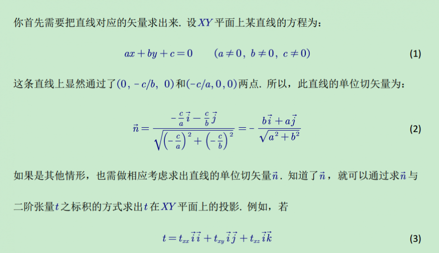 有一个张量 [xx xy xz yx yy yz zx zy zz] 怎么投影到xy平面上去? 也就是想知道xy平面上任意一条线上的投影值 |