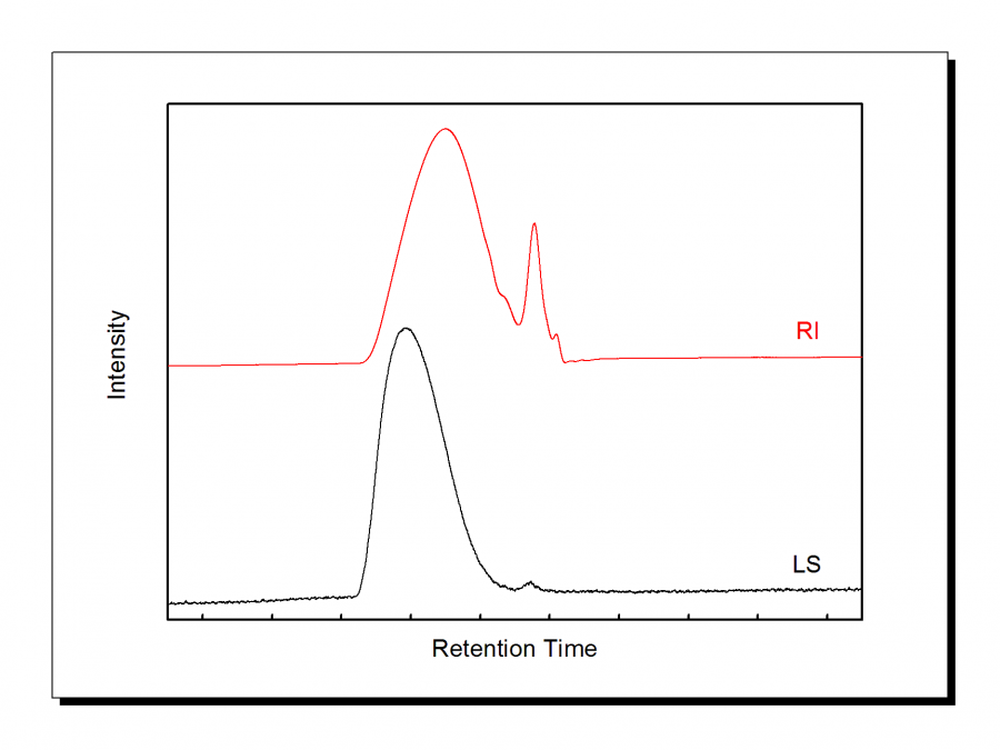聚羧酸减水剂的GPC测试通常需要碱性条件,与分子量大小和具体的分子结构都有关系。常规方法是从中性流动相开始,一边调整pH一边观察样品的溶解性。对于这个样品,单RI检测器可以观察到一宽一窄两个峰,对照LS检测器可知,宽峰为主要信号峰,窄峰为小分子物质(分子尺寸很小)。 Graph1.png |