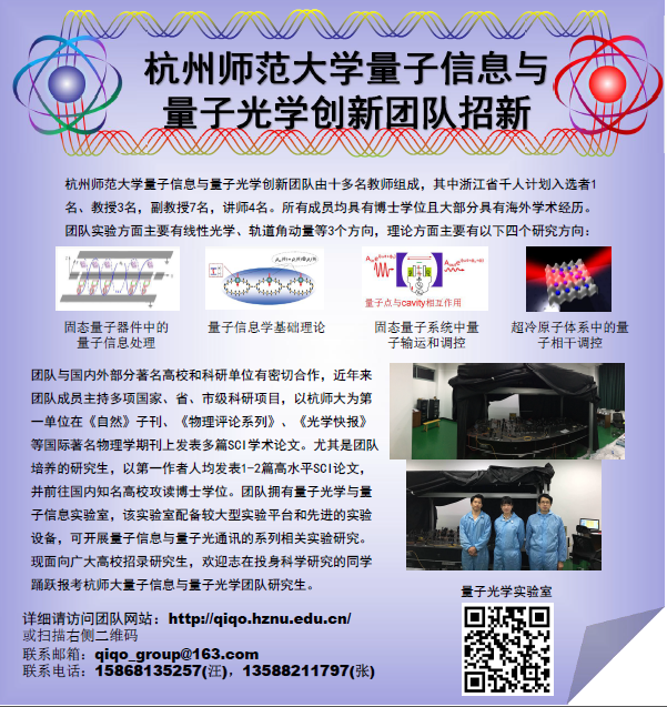 杭州师范大学量子信息与量子光学创新团队招收研究生,欢迎报考和调剂