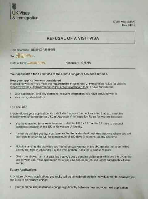 英国签证 在读研究生短期访问学者1000 被拒