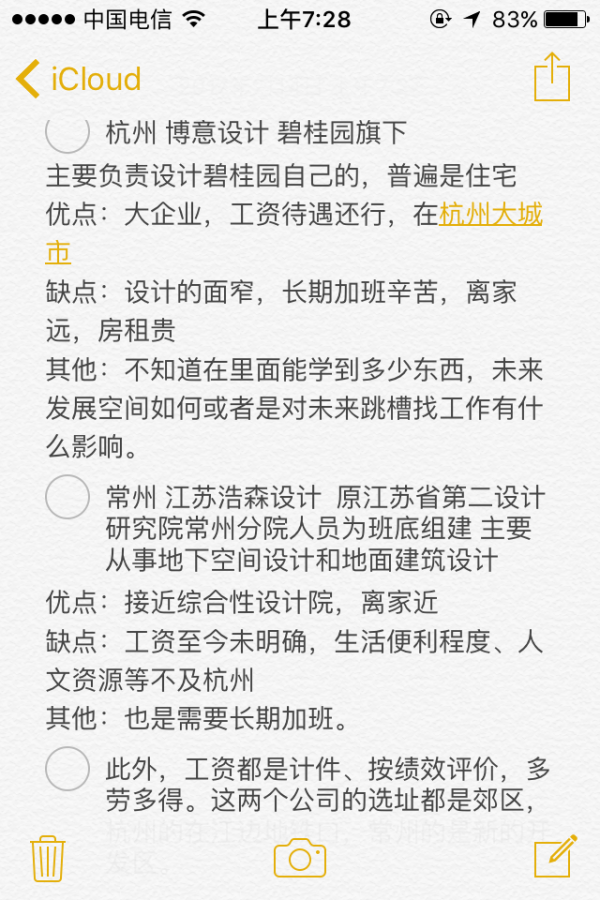 介绍下,本人女,本科毕业工作两年半。一直从事建筑结构设计。做过小高层剪力墙住宅,桩基;框架结构厂房小学等,桩基,条基等;及简单的加固工程。所有的设计流程都有参与。 现在的两个工作:A 杭州 博意设计院(碧桂园自己的设计院) B 江苏浩森建筑设计 (原江苏省第二建筑设计研究院常州分院人员为班底组建 此外打听到的常州市的大部分人防设计都是他们做的) 这两份工作比不上大牛们的,请勿见笑。 如图我列的两个公司情况与我个人分析的优劣。 此外,我未来人生目标是以后以土建为生,要么是能在甲方做个管理层,要么技术上能达到是结构设计的高工水平。(个人现在总还是有些“小野心”) 我现在万分纠结,一方面瞻前顾后,一方面当局者迷。恳请各位能给出一些看法和建议,不胜感激! 若是了解这两家公司情况的,或了解分别进这两家公司后未来发展(晋升或跳槽)的空间如何)麻烦多给我点信息,评论、站内私信、微信都可以。再次感谢! 祝大家新年快乐!论文、offer、事业、爱情等等,事事顺心! 发自小木虫IOS客户端 |