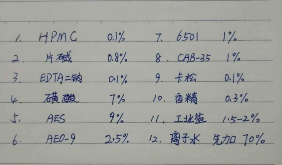 还有就是这个配方泡沫太多,不适合机洗,加3%的钾皂作消泡