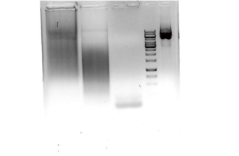 你去看你的用的酶的说明书,上面有一个dna模版做pcr适宜的浓度范围。从你的胶上看,dna浓度很大,而且有点降解了…你根据要求稀释一下dna,再试试! 发自小木虫IOS客户端 |