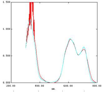 我现在做一个油墨的UV-紫外可见光谱分析,两个所用色料CI相同的色料的油墨,观察UV谱图,其中有一个在300-400nm处有大量的微小杂峰出现,另外一个确没有一点杂峰,想知道300-400nm处出现这种大量吸收杂峰是表征什么东西? 谱图.jpg |