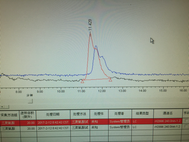 蓝色图谱为对照,红色为样品,经测试出峰时间未受流动相(单一通道含有乙腈)组分改变而延迟或提前,样品(三聚氰胺)要求不得检出,说能用也能用,但拿不出手啊…色谱柱用的是伊力特Hypersil ods2 250mm