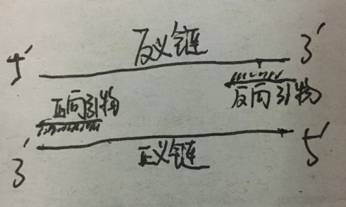 其实复制过程就是两个引物和两条链互补,3端一条引物,5端一条引物,所谓的正义链,反义链,正向引物,反向引物都是人物规定的,是相对概念,并不是绝对的。两条引物的目的是为了什么,这点你要搞清楚,我认为两条引物是为了复制出你要的目的片段,所谓两点确定一条线段,只要保证两条引物的分别与模板链互补,而不是在都与一条模板链互补 (这样相当于设计了一条引物)。 给你来张图:http://muchong.com/bbs/post.php?action=reply&fid=366&tid=11039906 QQ图片20170214120107.jpg |