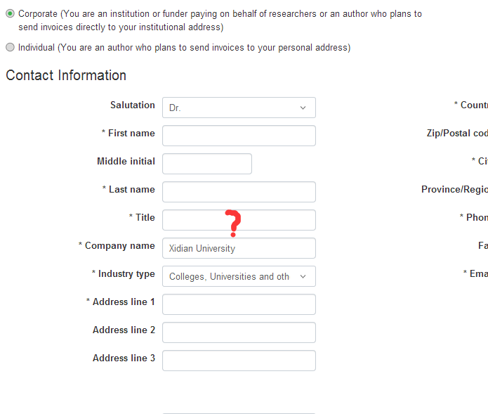 目前论文被AIP advances 录用了,要交版面费,给了一个RightsLink的链接,点进去缴费需要先注册,由于需要课题组报销,注册的时候需要选corporate项,注册时company name前有个title必须填,请问这一项填什么? )}O@(83`84M2$}0PBNHO(S5.png |