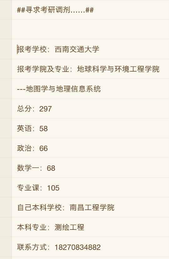 本人报考专业为地图学与地理信息系统,总分297,虽然分数不高,但是还是希望能继续学业,求导师收为关门弟子! 发自小木虫Android客户端 |