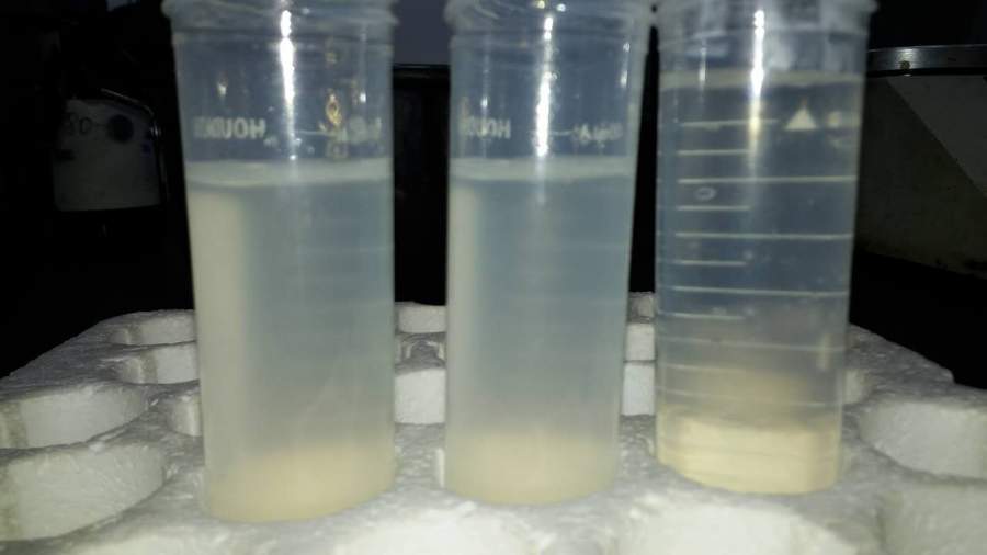 请求助大侠们: 老板让探索能够让瓜尔豆胶溶液澄清的方法, 目前,我用盐酸、过氧化氢能够让溶液稍微澄清, 但还是不够透亮。 请大侠们帮助: 寻找一个能够让不太透亮、澄清的溶液,变得透亮澄清。 图片中左侧两个是我做的结果, 希望能够到达右侧管子的效果。 非常感谢! 507418243205592751.jpg |