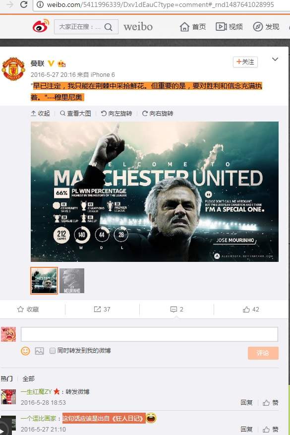 REF: https://weibo.com/5411996339/Dxv ... t#_rnd1487641028995 ALSO: https://tieba.baidu.com/p/763138127 这句话并不是穆里尼奥说的,而是一个中国人在他自己的微博里介绍穆里尼奥的文章里写的。你们不觉得这句话很中国式?所以英文和葡萄牙、西班牙文里并没有出处。 ----------- 来源.jpg |