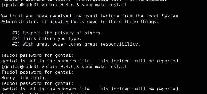 voro++软件安装,sudo make install后出现下图所示的结果,gentai is not in the sudoers file. this incident will be reported.不知道成功没,接下来改变安装路径该怎么整?哪位大神会安装或者用过该软件,能不能分享下经验,刚开始学习,很多都不会 发自小木虫Android客户端 |