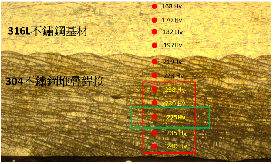 各位大家好 小弟这边有个问题想请教各位 我使用304不锈钢现在316L不锈钢基材上进行堆叠焊接 接着去量测硬度值 结果发现在中间部分(图片黄色字,绿色格子部分)硬度值都会下降 而且每一个参数都这样 就是中间会下降 小弟想请教各位 这样的原因是为什么呢? 因为从金像图中并看不出有何差异 还是因为热循环所导致的呢? 请各位指教 谢谢 金相.png |