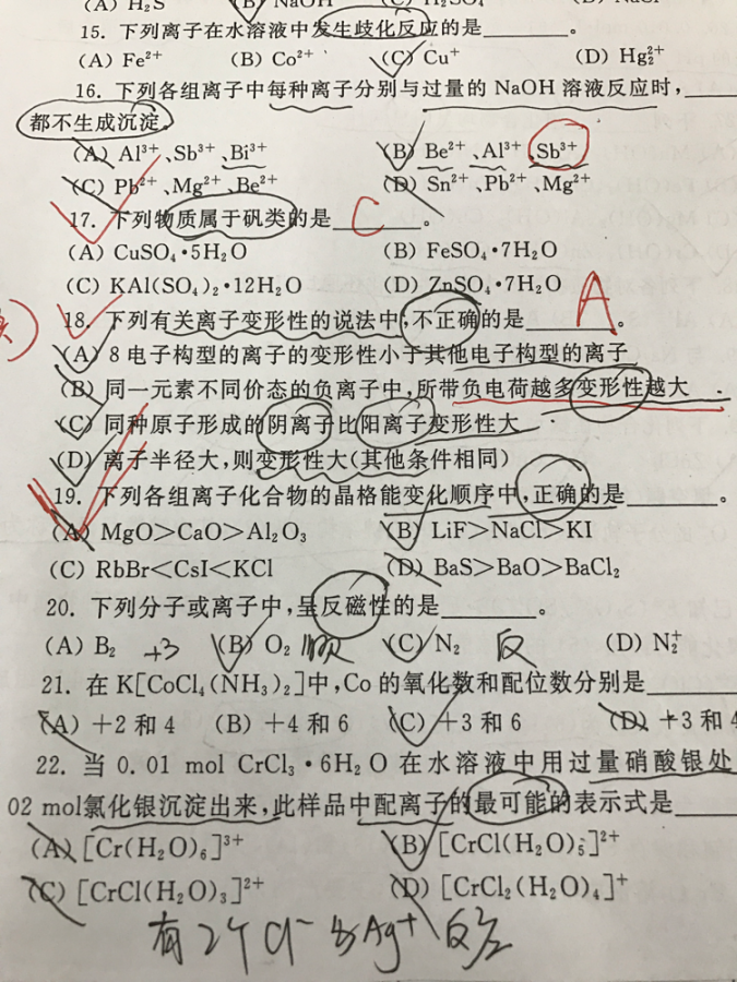 第19题,解释一下C项,C项的电荷相同,半径减小,晶格能增大啊,为啥不对呢求解 17题,为什么答案是C呢?我认为ABCD 都是矾啊 发自小木虫IOS客户端 |