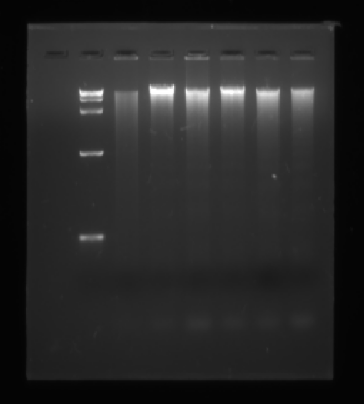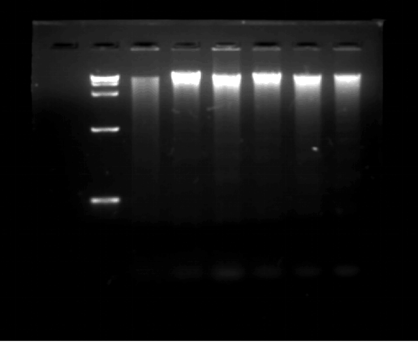 这是我最近跑的HepG2细胞DNA ladder的条带,分别是加入100μM的过氧化氢处理不同的时间,观察DNA的降解情况。可是发现条带很浅不清晰,但是测得的DNA浓度还很高,能达到1000多ng/μl;我的初始细胞浓度大概是6x10^5,求大神指点 @biostar2009 @飞约疯人院 @youlinglyw 发自小木虫IOS客户端 |