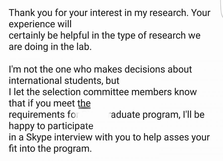 具体的requirements感觉就是网页上列出来的那些,拟了个中文稿,【感谢您百忙中回复邮件! 感谢您的肯定,感谢您就此事与录取委员会的老师联系!我真的想加入您的团队进行某某领域的研究,所以我非常期待能有机会参加您的面试。 另外,如果您想了解我的其他材料或者信息您随时告诉我就行。】 大概是这样子,不过教授也没提看简历什么的,所以有点摸不清 发自小木虫Android客户端 |