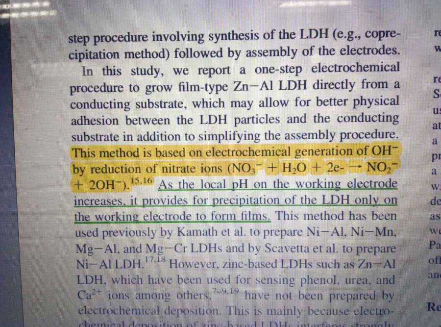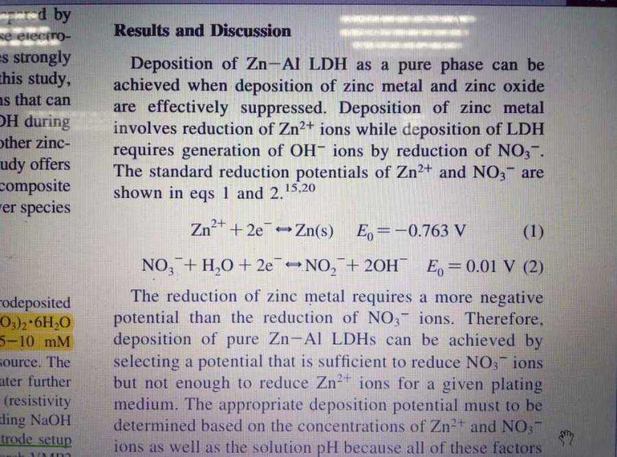 这是一篇电化学合成LDH水滑石薄膜的文献,电镀液溶液中有Zn离子,和铝离子,硝酸根离子,文中指出合成薄膜最佳ph是在3.8,但合成LDH是基于硝酸根离子的减少,生成氢氧根,从而合成LDH,问:酸性条件下,阴极不是应该是氢离子先得到电子生成氢气吗? 发自小木虫Android客户端 |