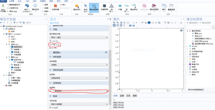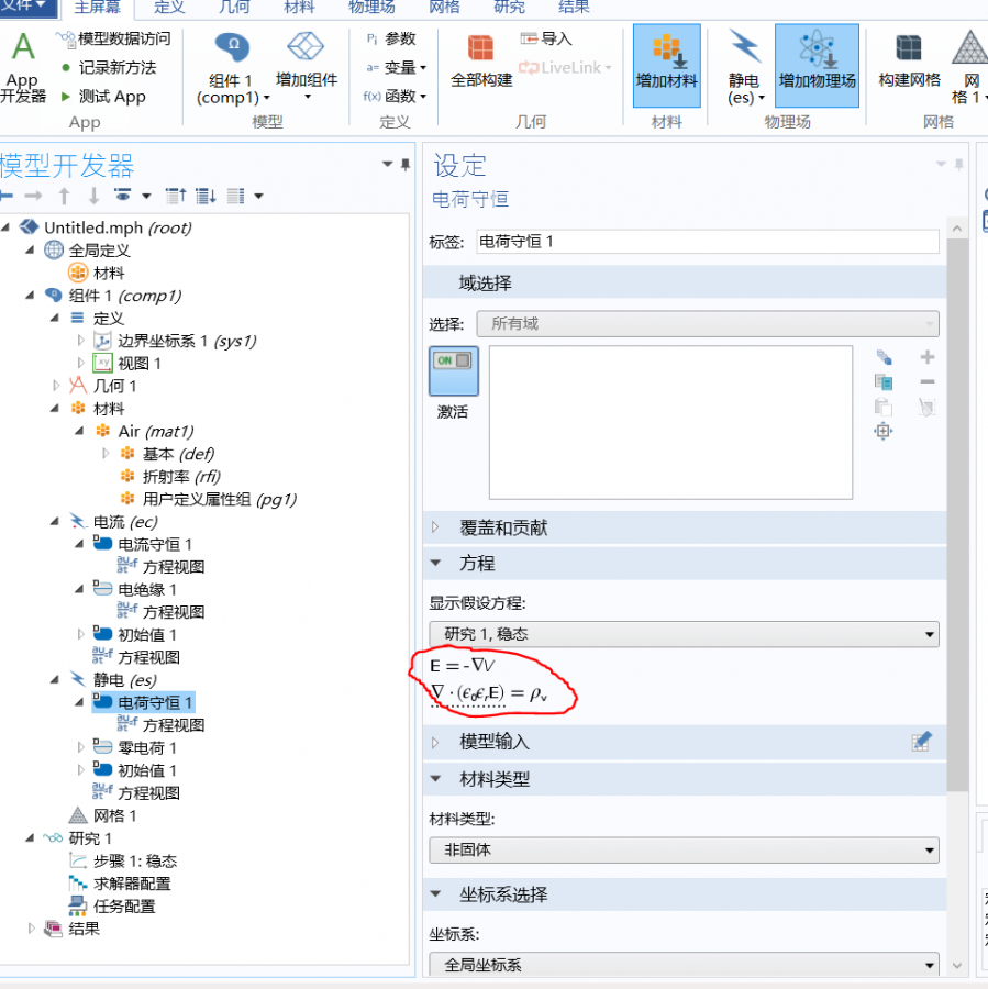 本人comsol新手,想解图一和图二中红圈内的方程组,其中导电率σ=a(常数)*ρv(空间电荷密度),请问各位大佬,我应该如何设置,才能将σ设置为ρ的函数? 如有回复,万分感激![]() 1.PNG 2.PNG |