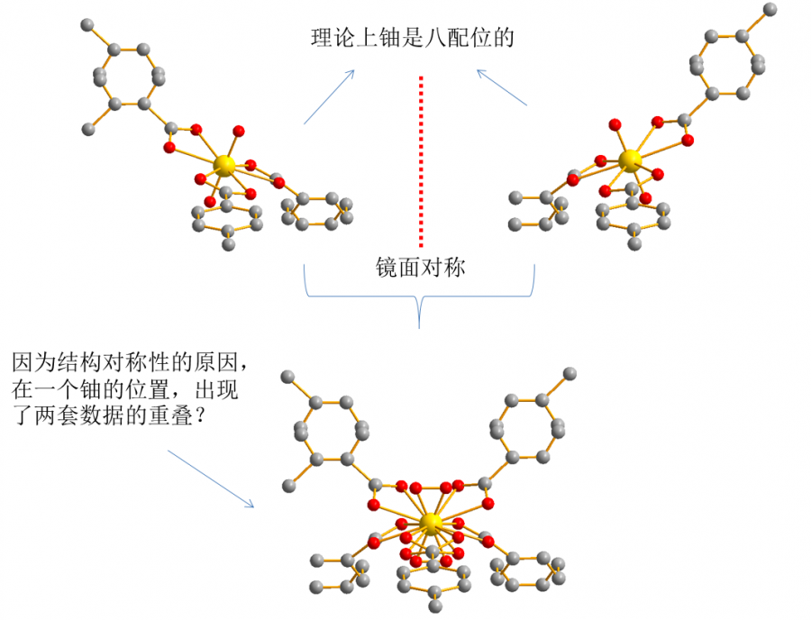 图中红字显示U处于四重对称轴上,不知道是不是这个原因,让U的配位从8配位显示为16配位。解出来的初步结构感觉就像是因为镜面对称引起的在同一个位置出现了两套数据的重叠。请高手帮忙看一下,谢谢大神。 1.png 5.png |
