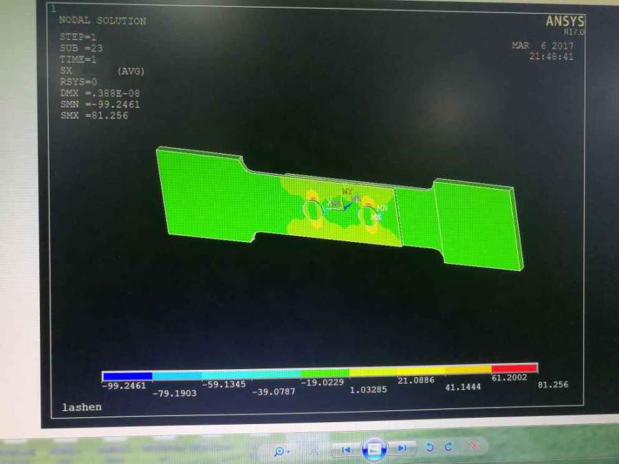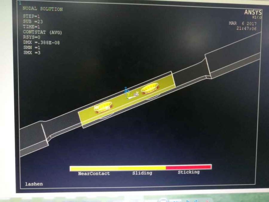 两块板通过螺栓连接,拉伸问题的求助,搞不懂什么原因导致算出来的应力特别小!由于第一次接触到接触分析,所以不是很懂,我觉得问题可能出在接触这一块,不知道大神能不能帮看下,还有一个可能就是我施加的约束不够?如果是约束的问题又该怎么加约束呢 附上命令: /prep7 /TITLE, lashen !定义单元类型及材料属性 et,1,solid185 et,2,plane182 mp,ex,1,190e6 mp,ex,2,184e6 mp,ex,3,69e9 mp,prxy,1,0.34 mp,prxy,2,0.3 mp,prxy,3,0.33 !定义参数 l1=100/1000 !试样长度 l2=34/1000 !夹头长度 w1=24/1000 !试样宽度 w2=33.8/1000 !夹头宽度 h=1.5/1000 !试样厚度 l3=48/1000 !试样交叠部分长度 r=4.9/1000 !连接圆弧半径 r1=6.25/2/1000 !圆台下表面半径 r2=8.75/2/1000 !圆台上表面半径 r3=4/1000 !螺母半径 pload1=100000000*2*h*w2 pload2=-pload1 !建立几何模型(TA32) block,-l3/2,-l3/4,0,w1/2,0,h block,-l3/4,0,0,w1/2,0,h block,-l3/4,0,-w1/2,0,0,h block,-l3/2,-l3/4,-w1/2,0,0,h block,0,l3/4,0,w1/2,0,h block,l3/4,l3/2,0,w1/2,0,h block,l3/4,l3/2,-w1/2,0,0,h block,0,l3/4,-w1/2,0,0,h wpoff,-12/1000,0,0 cone,r1,r2,0,h wpoff,24/1000,0,0 cone,r1,r2,0,h vsel,s,,,1,4,1 allsel vsbv,all,9 allsel vsel,s,,,5,8,1 allsel vsbv,all,10 numcmp,all CSYS,0 WPAVE,0,0,0 CSYS,0 block,-37.1/1000,-24/1000,-w1/2,w1/2,0,h k,73,-42/1000,w1/2+r,h k,74,-76/1000,w1/2+r,h k,75,-76/1000,-(w1/2+r),h k,76,-42/1000,-(w1/2+r),h larc,72,73,54,r l,73,74 l,74,75 l,75,76 larc,76,69,54,r lsel,s,,,125,129,1 lsel,a,,,120 al,all allsel vdrag,63,,,,,,121 block,-76/1000,-42/1000,-w2/2,w2/2,-h,0 numcmp,all nummrg,all a,73,82,79,76 vsba,10,8 numcmp,all allsel vglue,all !建立几何模型(7050) block,-l3/2,-l3/4,0,w1/2,-h,0 block,-l3/4,0,0,w1/2,-h,0 block,-l3/4,0,-w1/2,0,-h,0 block,-l3/2,-l3/4,-w1/2,0,-h,0 block,0,l3/4,0,w1/2,-h,0 block,l3/4,l3/2,0,w1/2,-h,0 block,l3/4,l3/2,-w1/2,0,-h,0 block,0,l3/4,-w1/2,0,-h,0 wpoff,-12/1000,0,0 cylind,0,r1,0,-h wpoff,24/1000,0,0 cylind,0,r1,0,-h vsel,s,,,14,16,1 vsel,a,,,9 allsel vsbv,all,21 vsel,s,,,17,20,1 allsel vsbv,all,22 CSYS,0 WPAVE,0,0,0 CSYS,0 block,24/1000,37.1/1000,-w1/2,w1/2,-h,0 k,139,42/1000,w1/2+r,0 k,140,76/1000,w1/2+r,0 k,141,76/1000,-(w1/2+r),0 k,142,42/1000,-(w1/2+r),0 larc,85,139,19,r l,139,140 l,140,141 l,141,142 larc,82,142,24,r lsel,s,,,186,187,1 lsel,a,,,192,193,1 lsel,a,,,167,197,30 al,all vdrag,99,,,,,,178 block,42/1000,76/1000,-w2/2,w2/2,0,h a,117,121,114,100 vsba,18,143 vsel,s,,,14,17,1 vsel,a,,,23,26,1 vsel,a,,,19,21,1 vsel,a,,,9 vglue,all numcmp,all !建立几何模型(1s627) wpoff,-12/1000,0,0 cone,r1,r2,0,h cylind,0,r1,0,-(h+h) cylind,r1,r3,-h,-(h+h) allsel vsel,s,,,25,27,1 vglue,all wpoff,24/1000,0,0 cone,r1,r2,0,h cylind,0,r1,0,-(h+h) cylind,r1,r3,-h,-(h+h) allsel vsel,s,,,27,30,3 vsel,a,,,26 vglue,all CSYS,0 WPAVE,0,0,0 CSYS,0 allsel !划分网格(TA32) MSHAPE,0,2D MSHKEY,1 mat,1 lsel,s,,,7,8 lesize,all,,,6 lsel,s,,,74,76,2 lesize,all,,,4 ALLSEL,ALL AMAP,39,4,33,32,5 lsel,s,,,17,18,1 lesize,all,,,6 AMAP,43,5,32,31,9 allsel AMAP,47,9,31,34,13 AMAP,50,13,34,33,4 lsel,s,,,4,6,2 lesize,all,,,4 ALLSEL,ALL AMAP,7,9,41,40,18 AMAP,14,18,40,39,21 AMAP,22,21,39,42,25 AMAP,34,25,42,41,9 lsel,s,,,35 lesize,all,,,3 vsel,s,,,1,8,1 vsweep,all asel,s,,,39,43,4 asel,a,,,47,50,3 asel,a,,,7,14,7 asel,a,,,22,34,12 aclear,all allsel vsweep,13 lsel,s,,,93 lesize,all,,,2,2 allsel lsel,s,,,97 lesize,all,,,2,0.5 vsweep,11 lsel,s,,,94,96,2 lesize,all,,,17 vsweep,12 vsweep,10 allsel !划分网格(7050) mat,3 AMAP,96,62,101,100,63 AMAP,121,63,100,99,76 AMAP,132,76,99,102,68 AMAP,129,68,102,101,62 AMAP,73,76,109,108,77 AMAP,114,77,108,107,83 AMAP,117,83,107,110,88 AMAP,111,88,110,109,76 lsel,s,,,125 lesize,all,,,3 vsel,s,,,17,21,1 vsel,a,,,23,24,1 vsel,a,,,9 vsweep,all asel,s,,,73,96,23 asel,a,,,111,117,3 asel,a,,,121,129,8 asel,a,,,132 aclear,all allsel lsel,s,,,218,220,2 lesize,all,,,7 vsweep,22 lsel,s,,,199,200,1 lesize,all,,,2,2 vsweep,14 lsel,s,,,185,187,2 lesize,all,,,17 vsweep,16 vsweep,15 !划分网格(1s627) mat,2 lsel,s,,,231,234,1 lesize,all,,,12 vsweep,25 lsel,s,,,259,262,1 lesize,all,,,12 vsweep,28 lsel,s,,,255,258,1 lesize,all,,,12 vsweep,29 lsel,s,,,241,244,1 LESIZE,all, , ,12 vsweep,26 lsel,s,,,291,294,1 lesize,all,,,12 vsweep,31 lsel,s,,,287,290,1 lesize,all,,,12 vsweep,32 allsel !建立接触对 mp,mu,4,0.3 mat,4 r,4 real,4 et,3,targe170 et,4,conta173 !generate the target surface asel,s,,,135,136,1 cm,left_up_bolt,area cmsel,s,left_up_bolt type,3 nsla,s,1 esln,s,0 esurf,all allsel !generate the contact surface asel,s,,,37,45,4 asel,a,,,48 cm,left_up_plate,area cmsel,s,left_up_plate type,4 nsla,s,1 esln,s,0 esurf,all allsel !generate the target surface mat,4 r,5 real,5 et,5,targe170 et,6,conta173 asel,s,,,147,148,1 cm,left_down_bolt,area cmsel,s,left_down_bolt type,5 nsla,s,1 esln,s,0 esurf,all allsel !generate the contact surface asel,s,,,94,97,3 asel,a,,,99,100,1 cm,left_down_plate,area cmsel,s,left_down_plate,area type,6 nsla,s,1 esln,s,0 esurf,all allsel !generate the target surface mat,4 r,6 real,6 et,7,targe170 et,8,conta173 asel,s,,,140,141,1 cm,right_up_bolt,area cmsel,s,right_up_bolt type,7 nsla,s,1 esln,s,0 esurf,all allsel !generate the contact surface asel,s,,,3,9,6 asel,a,,,19,32,13 cm,right_up_plate,area cmsel,s,right_up_plate type,8 nsla,s,1 esln,s,0 esurf,all allsel !generate the target surface mat,4 r,7 real,7 et,9,targe170 et,10,conta173 asel,s,,,160,161,1 cm,right_down_bolt,area cmsel,s,right_down_bolt type,9 nsla,s,1 esln,s,0 esurf,all allsel !generate the contact surface asel,s,,,56,74,18 asel,a,,,77,87,10 cm,right_down_plate,area cmsel,s,right_down_plate type,10 nsla,s,1 esln,s,0 esurf,all allsel !generate the target surface mat,4 r,8 real,8 et,11,targe170 et,12,conta173 asel,s,,,6,13,7 asel,a,,,20,33,13 asel,a,,,38,46,4 asel,a,,,49 cm,left_plate,area cmsel,s,left_plate type,11 nsla,s,1 esln,s,0 esurf,all allsel !generate the contact surface asel,s,,,129,132,3 asel,a,,,96,121,25 asel,a,,,111,117,6 asel,a,,,73,114,41 cm,right_plate,area cmsel,s,