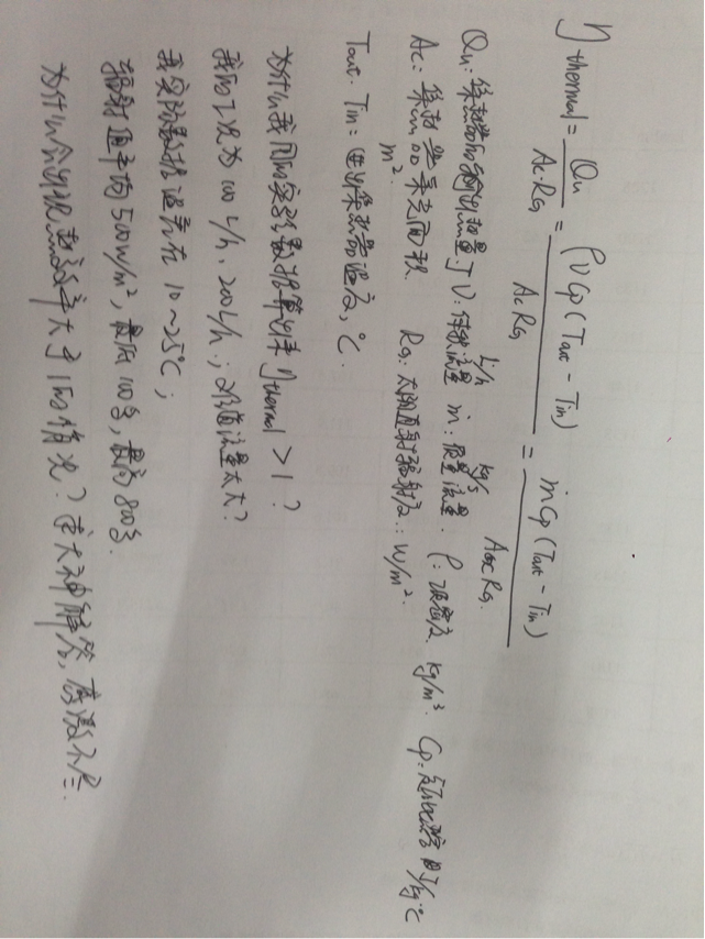 我用真空管集热器做实验加热工质,实验数据算出来的热效率全部大于1,有的甚至大于10,这是什么原因呢?之前课题组也有同学遇到类似的问题,求大神解答!我的计算公式见图,谢谢啦 发自小木虫IOS客户端 |