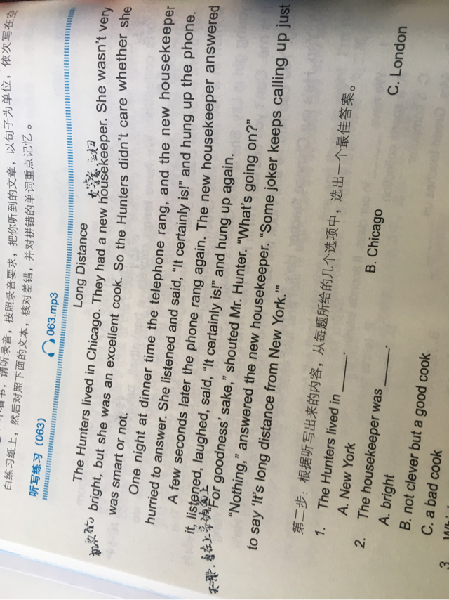看了一下全文,housekeeper 果然不聪明啊。同意五楼。电话里的人的意思是“这是来自纽约的长途电话”。但是housekeeper 理解成了其他意思(比如,这里离纽约很远啊!),以为是别人开玩笑的。