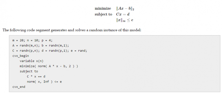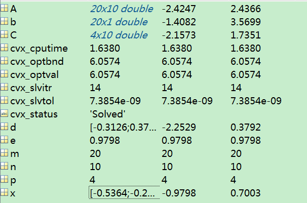 请教各位大神一个问题。最近需要用到凸优化的工具包,但是官网上给的示例看不明白,麻烦哪位大神讲解一下。 图1为给出的示例,图2、3、4为matlab运行后的结果。 我想知道这个示例是要干什么?对什么东西做寻优处理,最后得到的结果是什么? 多谢多谢!!!(小弟不才,一共只有5个金币,全散了。还望大神不吝赐教!) 捕获.PNG 捕获1.PNG 捕获2.PNG 捕获3.PNG |