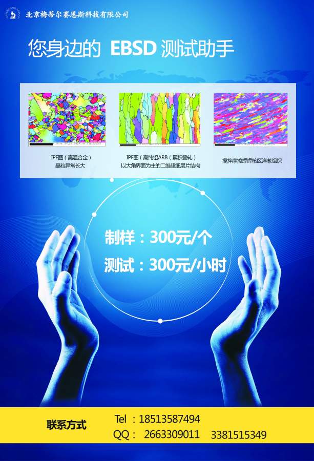 各位大神,请问那里可以测试金属(铜箔)的晶粒大小和晶向指数,目前我知道EBSD可以测试,但是不知道那里可以进行EBSD测试? 请教各位大神,那里可以测EBSD啊? 发自小木虫Android客户端 |
