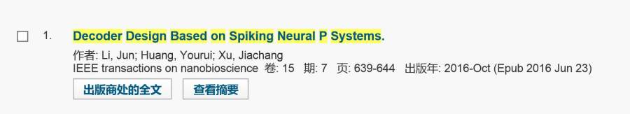 帮忙看下这篇文章有没有被SCI检索 Li J, Huang Y, Xu J. Decoder Design Based on Spiking Neural P Systems[J]. IEEE Transactions on NanoBioscience, 2016, 15(7): 639-644. |